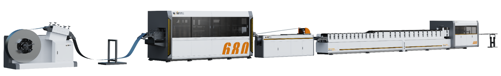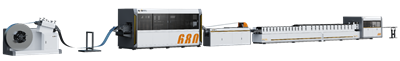 卷料送料的同時即可完成卷料開料,送料后,通過液壓沖壓的方式,實現(xiàn)各類孔位的成型,沖孔完畢后,通過冷彎成型的方式,實現(xiàn)門框框型的成型,而成型和沖孔之間通過儲料架或挖地坑的方式,實現(xiàn)卷料的預(yù)存,以保障成型機的生產(chǎn)效率,成型完畢后再次通過液壓沖壓的方式,完成需補沖孔位的成型,最后通過液壓沖剪的方式,實現(xiàn)斷面成型及長度輸出,同時整線采用PLC控制系統(tǒng),可按需組合沖孔模具,按需定制門框長度,按需選取沖剪斷面,一臺設(shè)備即可實現(xiàn)整扇門框上框/鎖框/鉸鏈框的生產(chǎn)(諾下檔框材質(zhì)框型一致亦可同步完成)。
